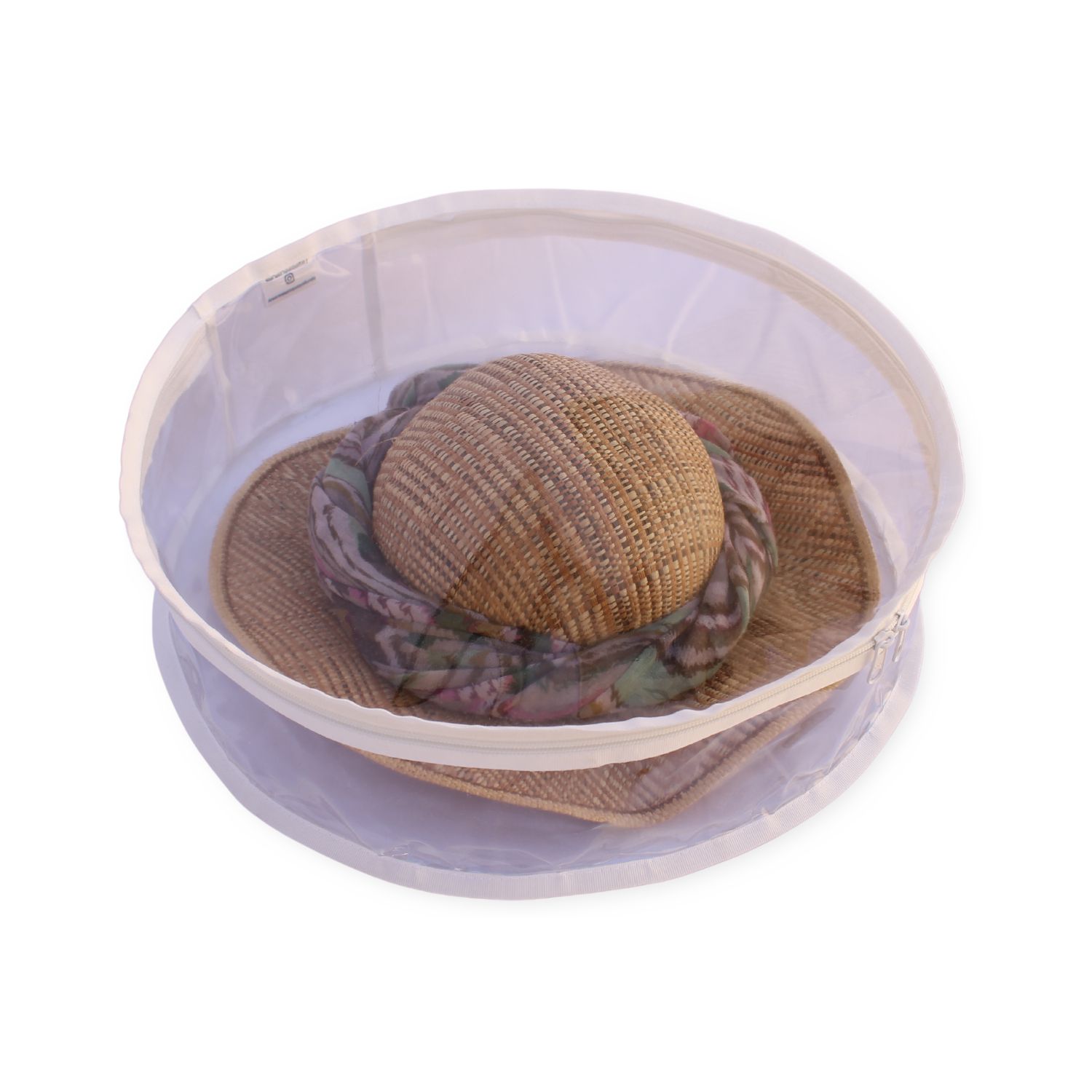 Organizador Redondo é feito em PVC cristal e viés de nylon na cor branca.