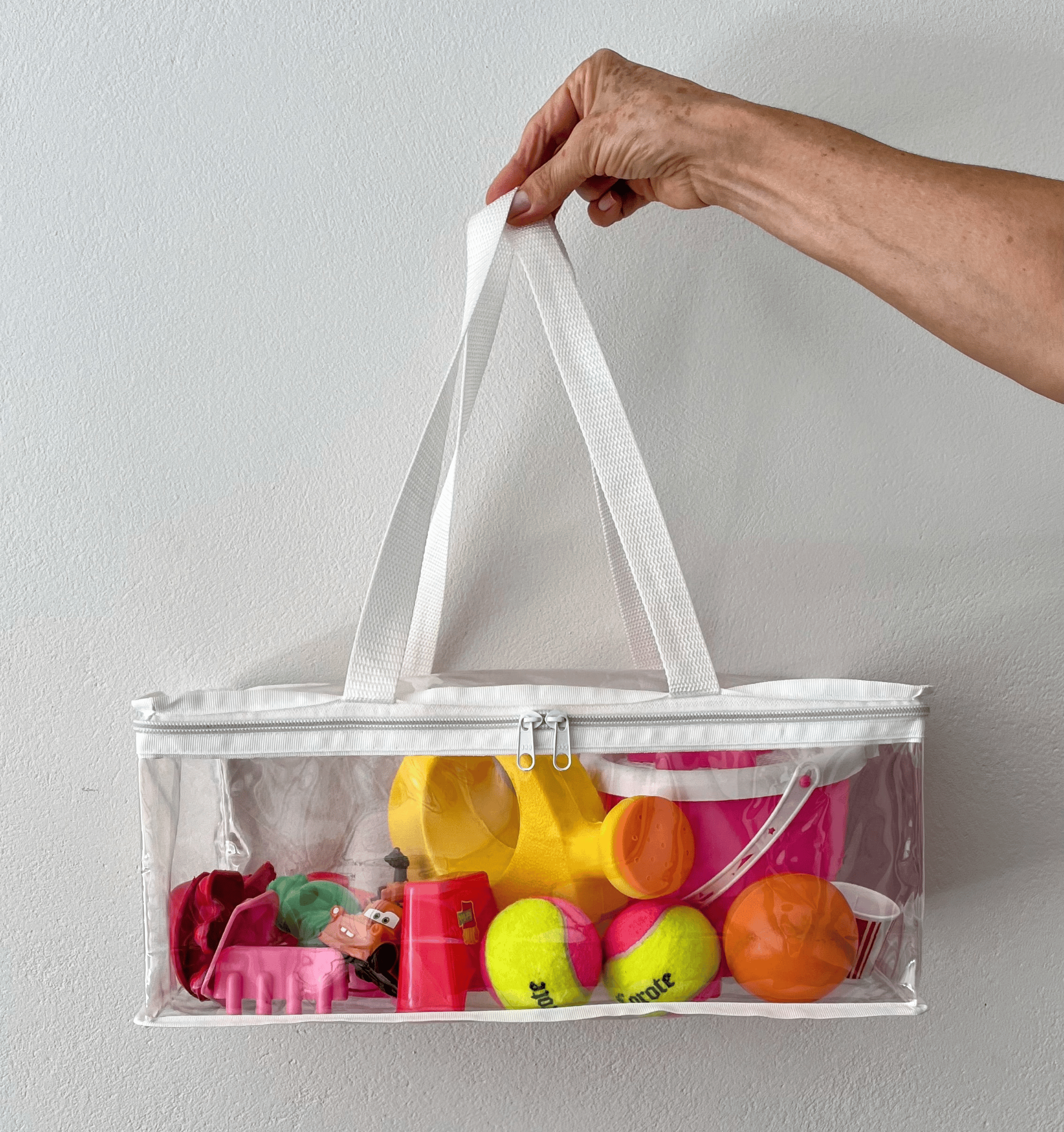 01 Organizador Retangular com alçca em PVC cristal rígido e viés de nylon branco.
